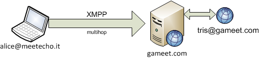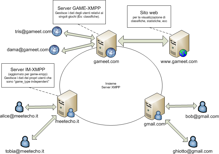 Il server di gioco, in figura chiamato gameet.com, gestisce i vari giochi disponibili sulla piattaforma. Ad ogni gioco è associato un JID fittizio, con il quale è univocamente identificato come risorsa XMPP, nell'esempio abbiamo tris@gameet.com e dama@gameet.com. Altri compiti del server di gioco sono la gestione dei dati degli utenti, delle credenziali di accesso e dei punteggi di ciascun utente al fine di poter stilare le classifiche. Inoltre è compito del server di gioco tenere traccia dell'esito delle partite effettuate da ciascun utente, in modo da poterne gestire in modo affidabile e coerente il punteggio. Nei capitoli successivi saranno illustrate le soluzioni adottate per risolvere problemi di autenticazione degli utenti, gestione della coerenza, affidabilità e sicurezza dei risultati.