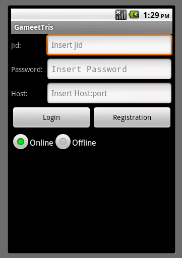 Gameet è stata pensata come modulo integrabile nell'ambito di applicazioni più complesse basate su XMPP, per questo motivo si è scelto di fare in modo che gli utenti potessero utilizzare il proprio account XMPP senza dover effettuare un'ulteriore registrazione.