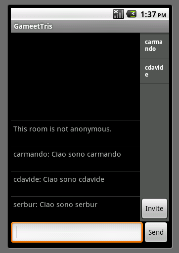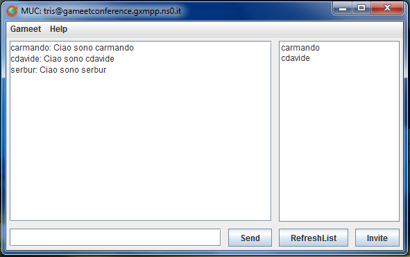 * Modalità Online: dopo la fase di login, che ogni utente effettua presso il proprio server XMPP, gli utenti condivideranno una chat comune relativa ad un determinato game, sulla quale è possibile scambiarsi messaggi o avviare una sessione di gioco con uno tra gli utenti disponibili.